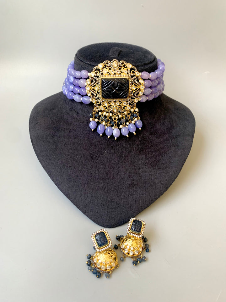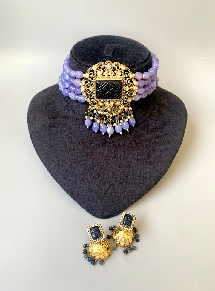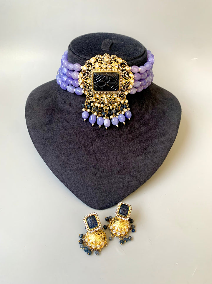 Embrace timeless beauty with our Indian Amrapali Choker Set, beautifully crafted on German onyx beads and paired with stunning jhumki earrings.