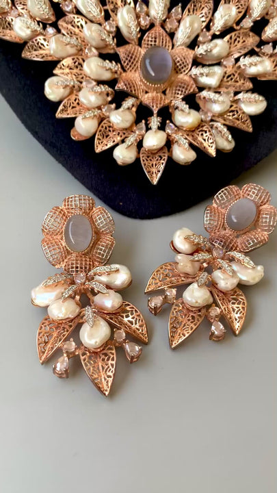 Experience timeless elegance with our Indian Baroque-style heavy necklace set, beautifully finished in a luxurious dull rosegold polish. Paired with matching earrings, this designer set brings a graceful royal charm to any traditional or formal look.
