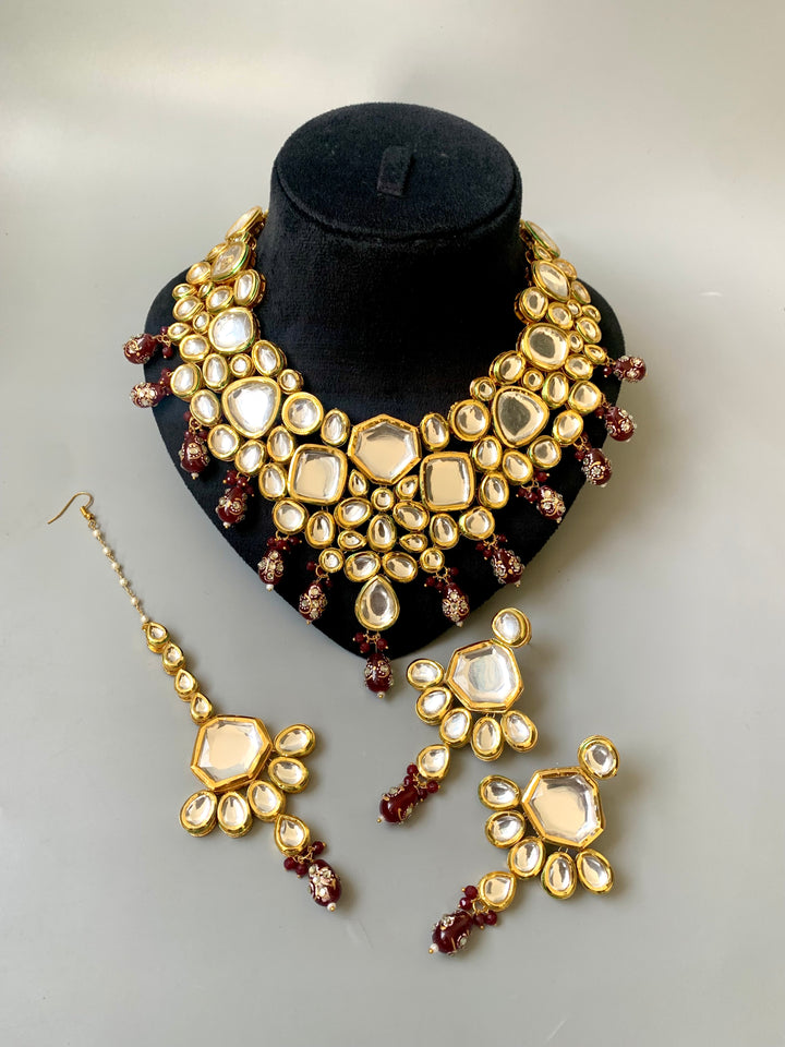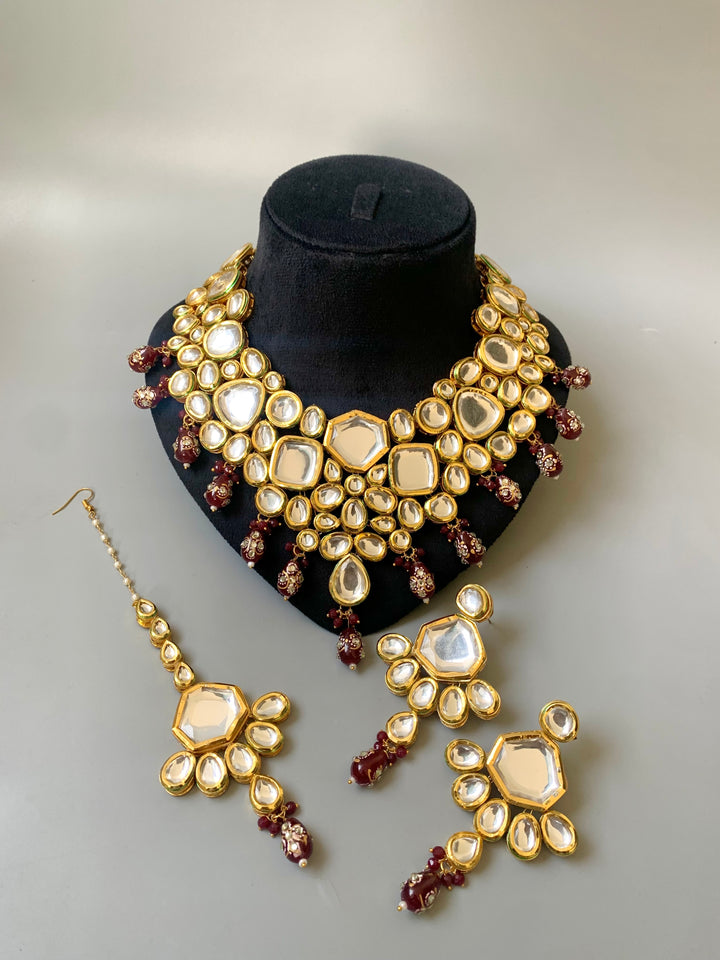 Make your big day unforgettable with our Indian Heavy Kundan Bridal Necklace Set, complete with tika, earrings, and stunning back-meena work.