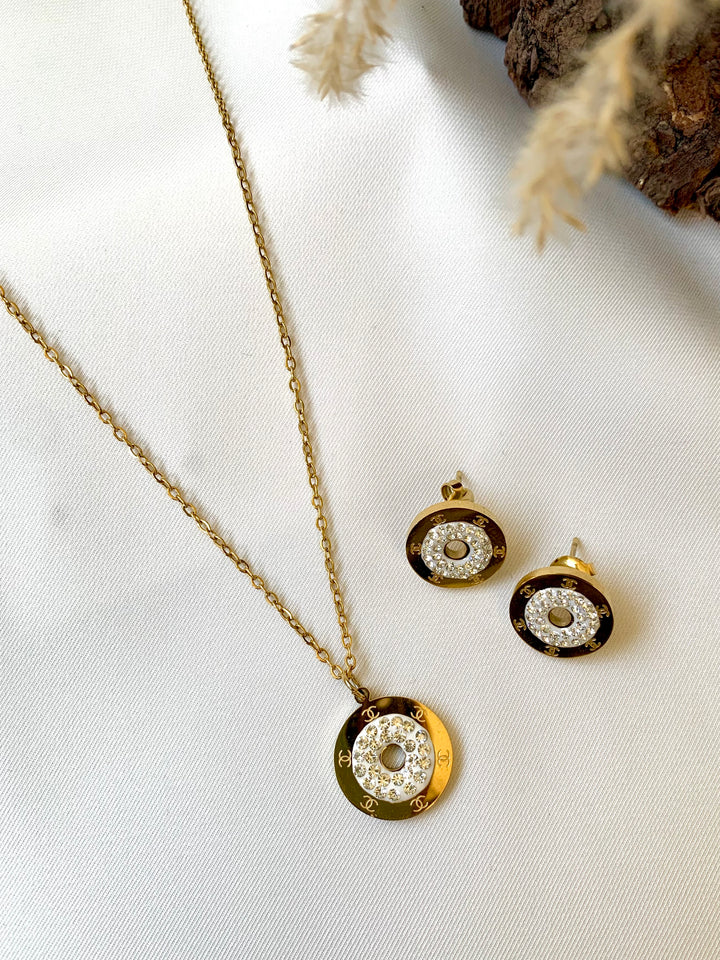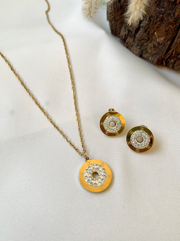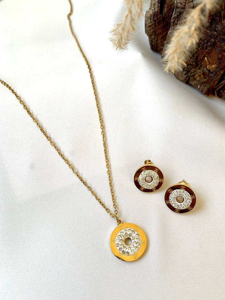 Elevate your everyday elegance with our 316L Gold-Plated Tory Burch Pendant Set, paired with matching studs.