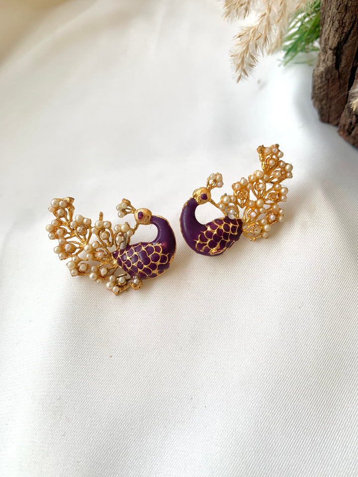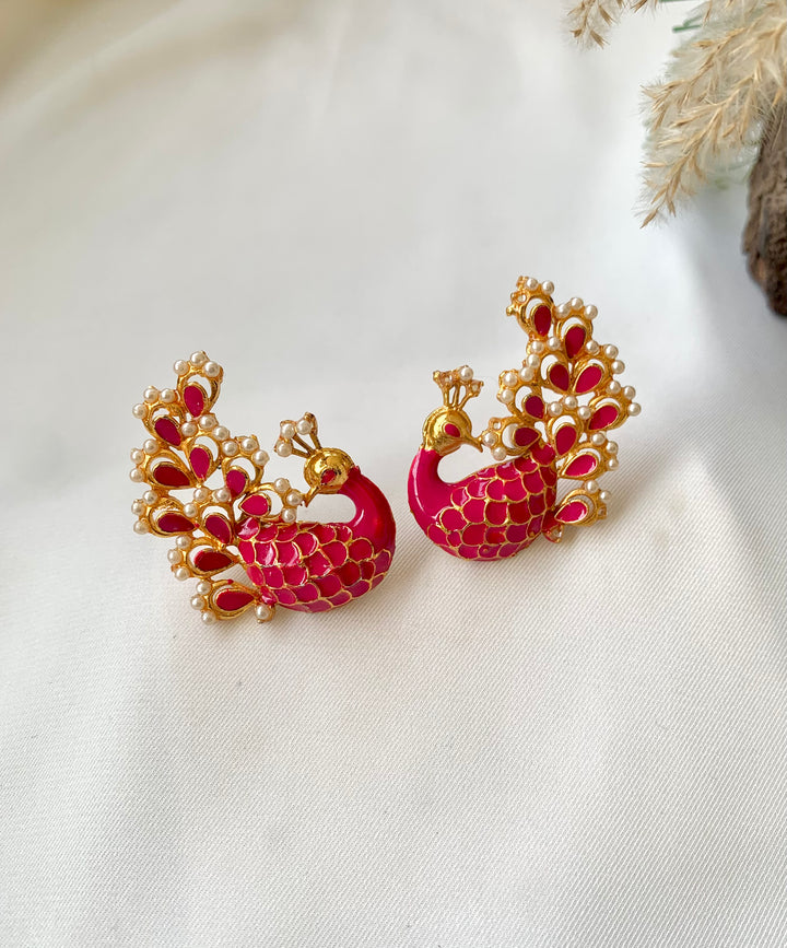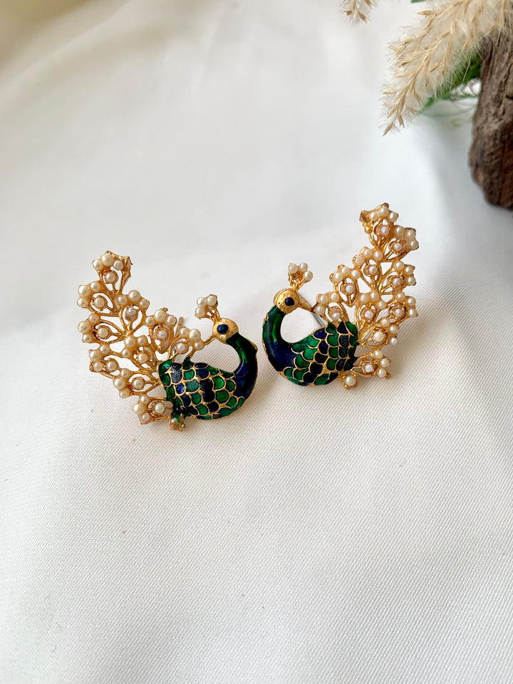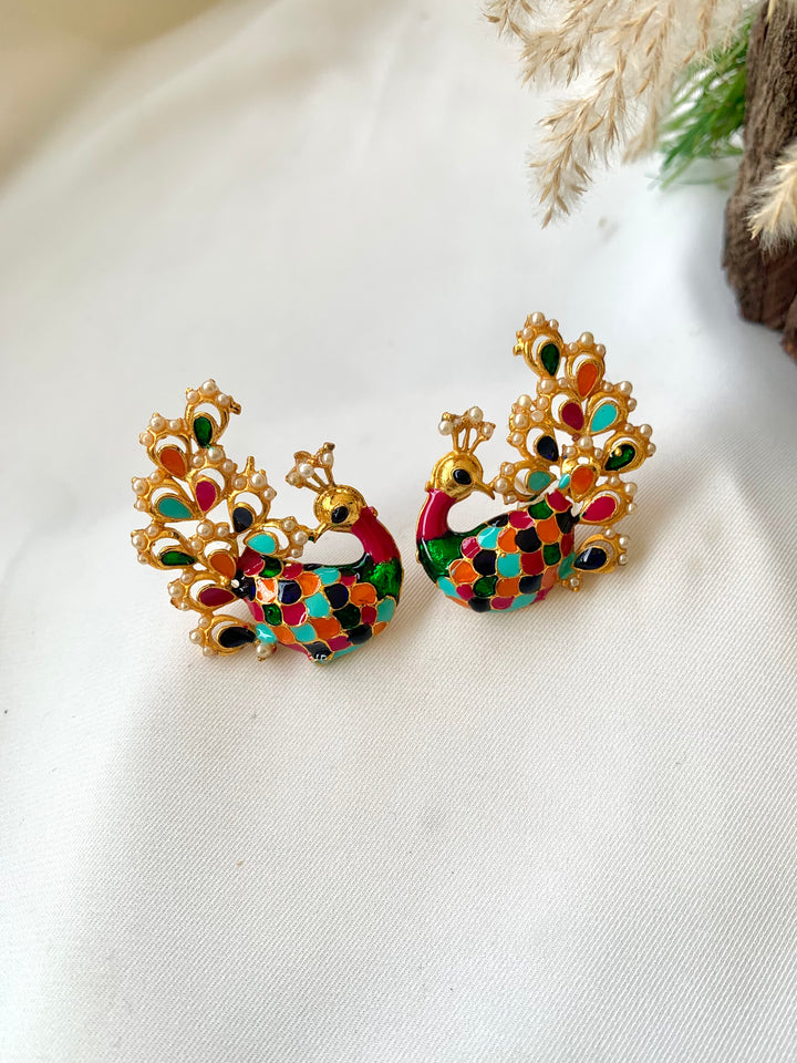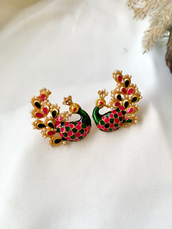 Elegant peacock studs adorned with Meena painting, showcasing intricate detailing and vibrant colors.