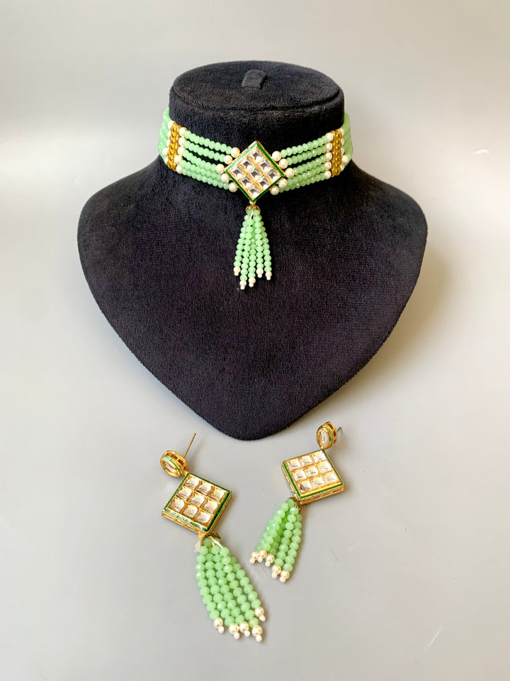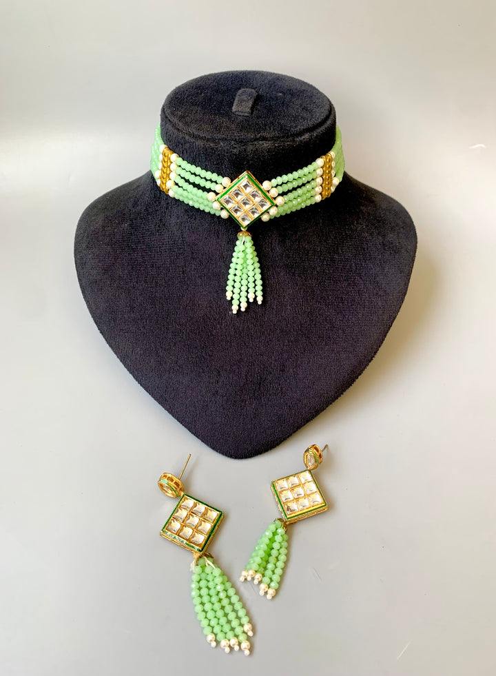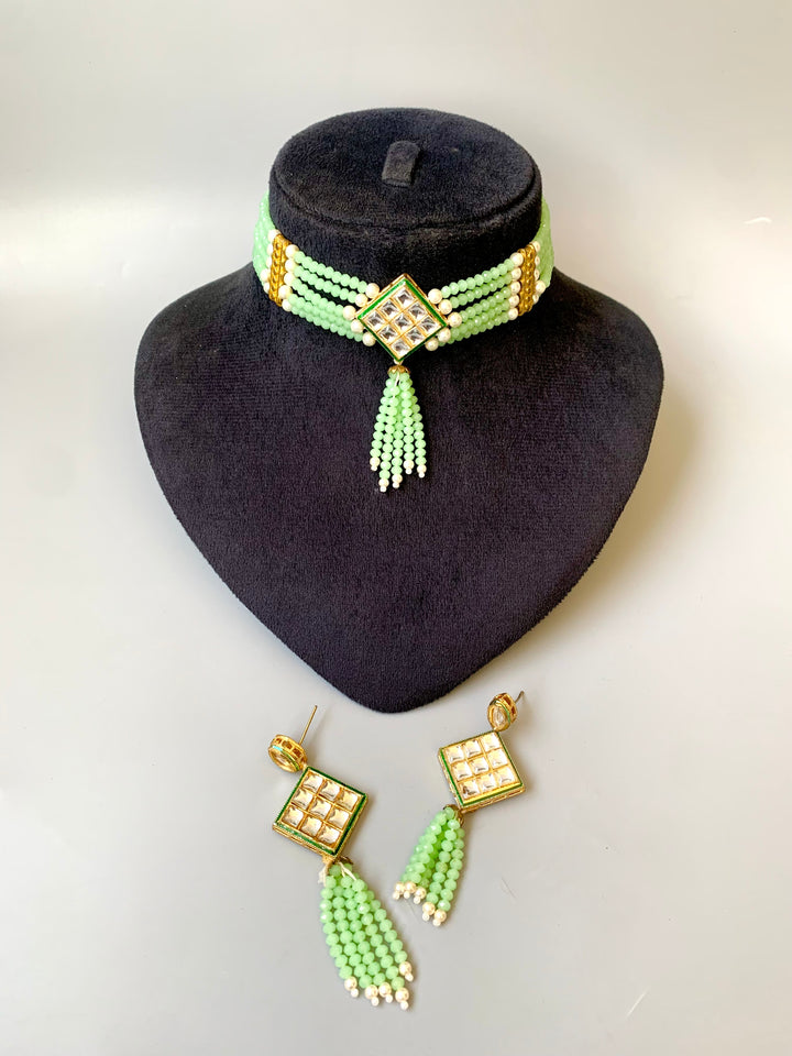 Enhance your festive style with our Indian Light Kundan Choker Set, beautifully adorned with matte green beads and paired with matching earrings.