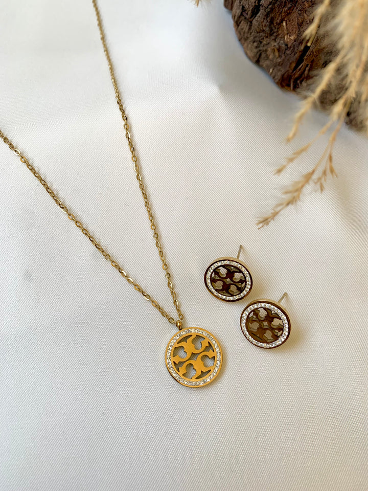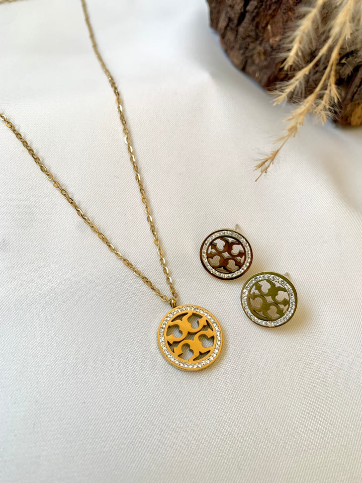 Elevate your everyday elegance with our 316L Gold-Plated Tory Burch Pendant Set, paired with matching studs.